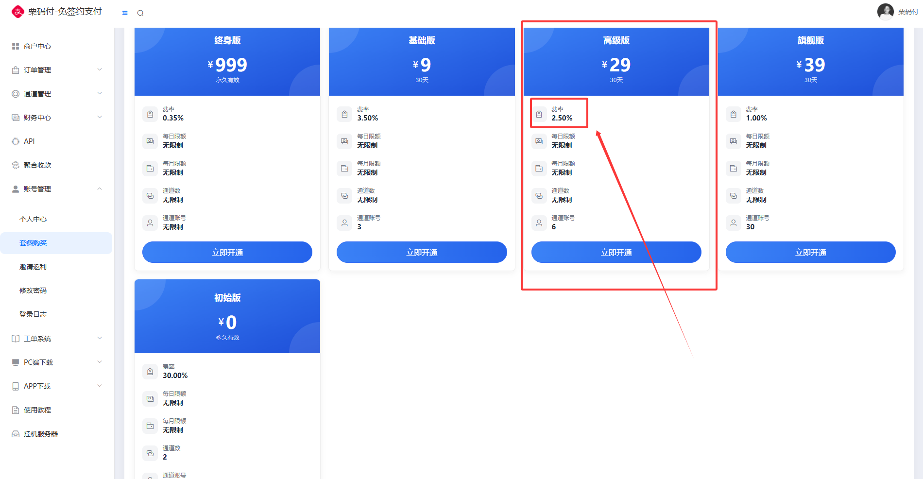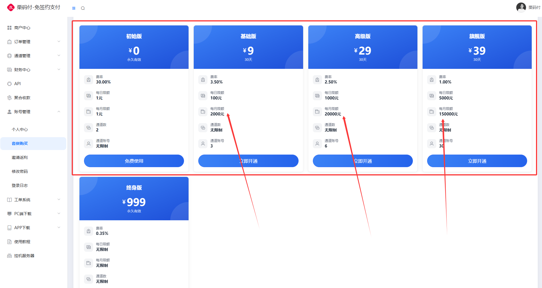 - 不同的套餐是有不同的限额标准,若非无限制套餐,则每日或每月收款会有对应限制,若是遇到超出限额,可选择升级套餐进行使用